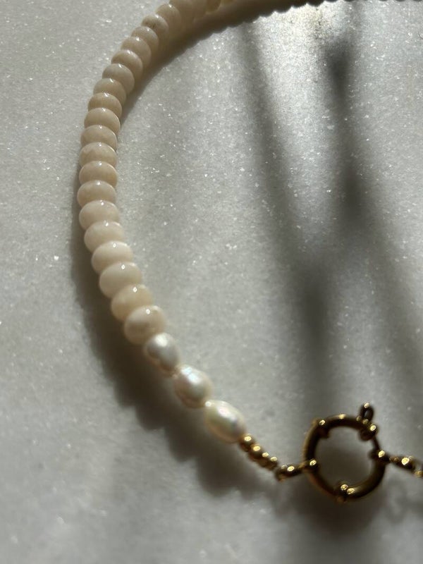 Deze handgemaakte ketting is precies wat je nodig hebt voor een frisse en vrouwelijke look. De zachte lichtgele/beige tint van artificial jade in combinatie met glanzende parels geeft dit sieraad een elegante en moderne uitstraling. Artificial jade staat bekend om haar zachte, harmonieuze energie en voegt een subtiele warmte toe aan elke outfit.