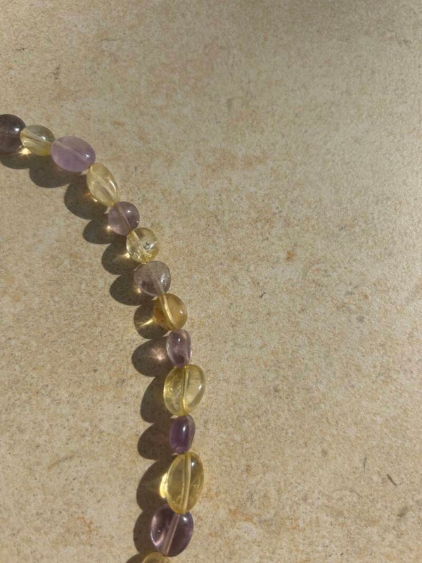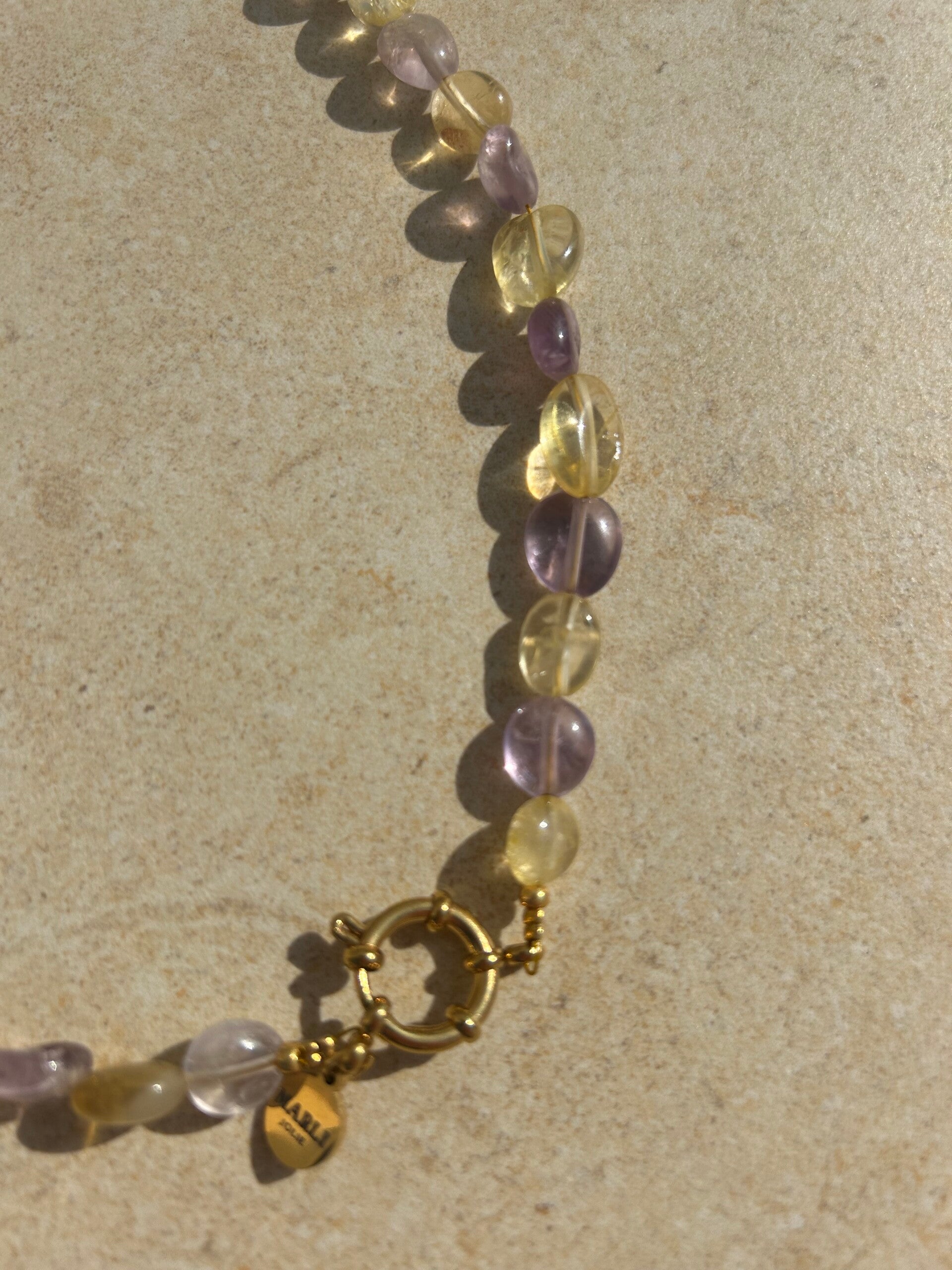 Hippe, handgemaakte kralenketting met gele en lila kwarts. De 8 mm natuurstenen kralen geven een frisse, vrolijke uitstraling, perfect om je look een subtiele kleurboost te geven. De goudkleurige stainless steel sluiting is een stijlvolle eyecatcher die je naar wens voor of achter kunt dragen. De ketting is afgewerkt met het verfijnde Marli Jolie-logo.